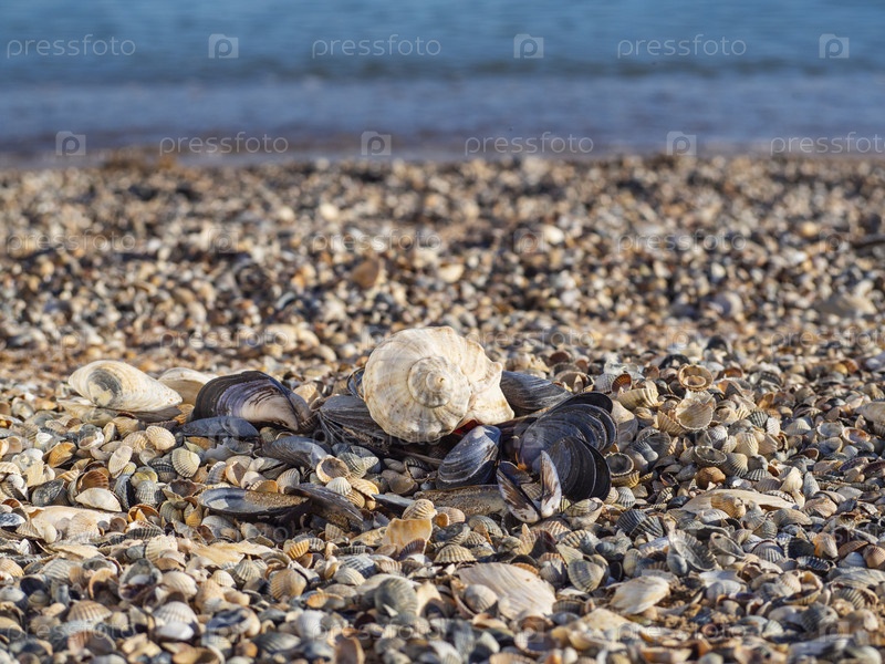Морской пляж из ракушек. Крупный план кучи ракушек на пляже