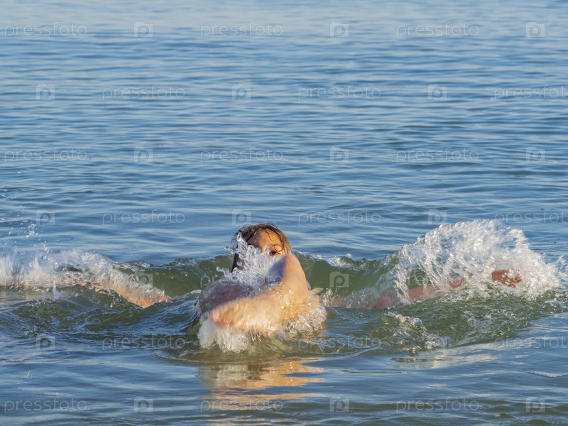 Крупный план девушки, плывущей на спине по синему морю. Брызги воды. Красивый естественный летний фон