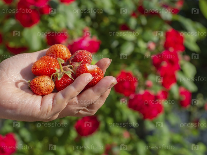 Женская ладонь наполнена спелой красной клубникой. Крупный план натуральных органических ягод, выращенных в собственном саду, на руке женщины на фоне расфокусированного куста красной розы с цветами