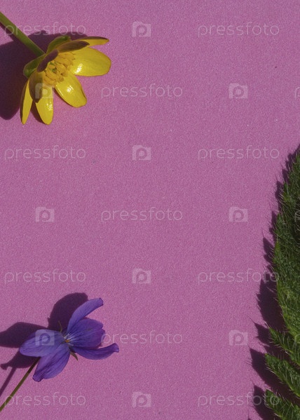 Цветочная композиция на розовом фоне. Желтые и фиолетовые цветы и зеленый лист, освещенный солнечным светом, лежат на текстурированной розовой поверхности. Пустое пустое место для текста