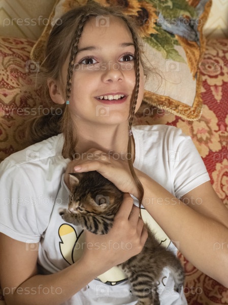 Счастливая девочка с котенком. Улыбающаяся девочка-подросток смотрит в окно и гладит милого маленького котенка. Реальная жизнь. Радостные эмоции на лице ребенка