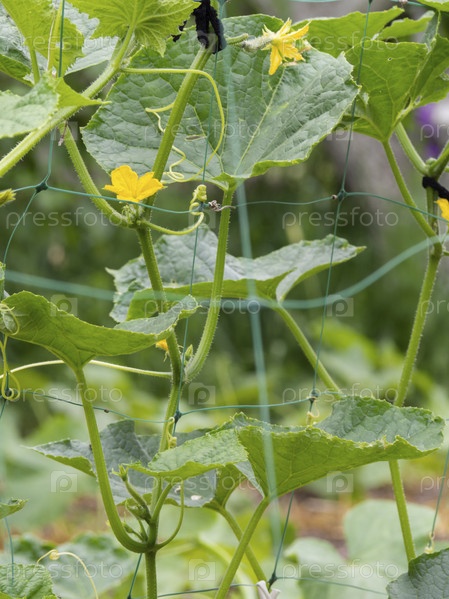 Зеленый огуречный куст с цветами и небольшими завязями огурцов на сетке в открытом грунте. Выращивание экопродуктов в естественных условиях