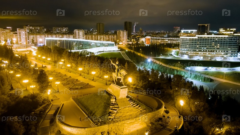 Уфа, Россия. Сквер имени Салавата Юлаева. Панорама города. Огни ночного города, вид с воздуха