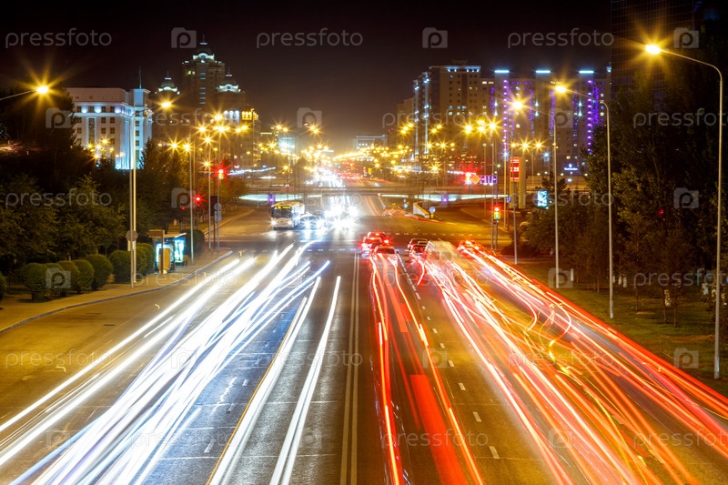 Проспект Эль Мангилик. Ночной трафик. Астана, Казахстан