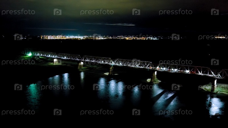 Уфа, Россия. Железнодорожный мост через реку Белую. Ночной поезд, вид с воздуха