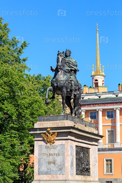 Памятник Петру I на площади Петра Великого.Текст переведен на английский язык: Прадед от правнука 1800 г