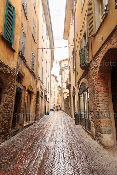 Бергамо, Италия. Улица Виа Бартоломео Коллеони в исторической части города. Дождливая погода