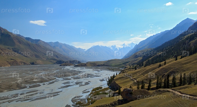 Горная долина с рекой и дорогой. Кыргызстан, Тянь-Шань