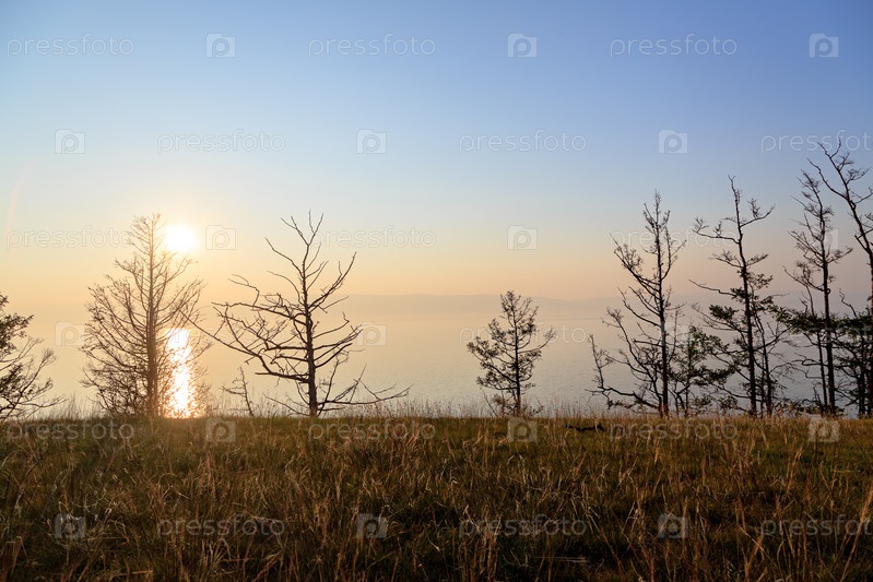 Заходящее солнце за ветвями деревьев над заливом Малого Байкала. Россия, остров Ольхон