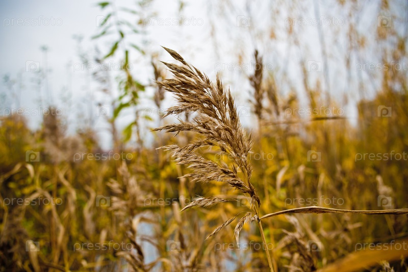 Осенний пейзаж с опавшими листьями и сухой травой крупным планом