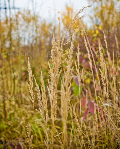 Осенний пейзаж с опавшими листьями и сухой травой крупным планом
