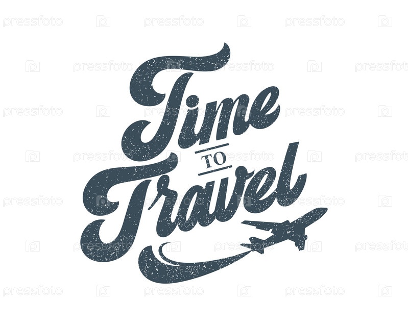 Время путешествовать рукописные надписи. Время путешествовать типографский векторный дизайн для поздравительных открыток и плакатов. Логотип с летающим самолетом. Празднование шаблона дизайна. Векторная иллюстрация