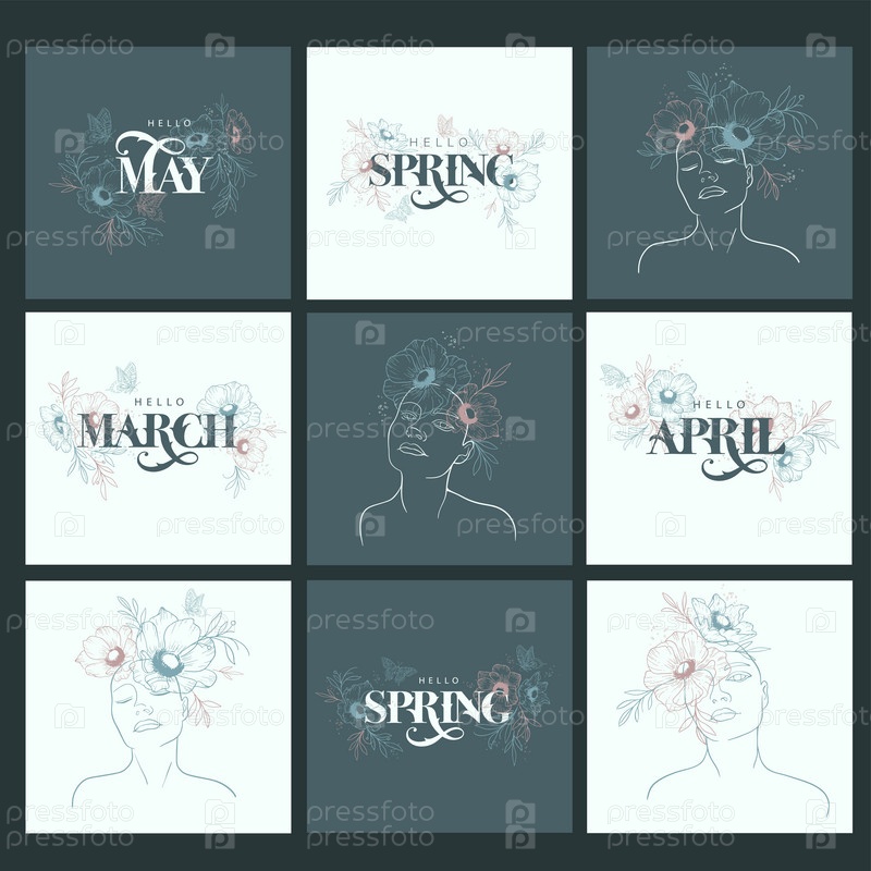 9 готовых весенних открыток. Здравствуй весна, здравствуй март, здравствуй май, здравствуй апрель. Векторный текст. Весенние месяцы рукописные. Шаблоны для рекламы, поздравительных открыток