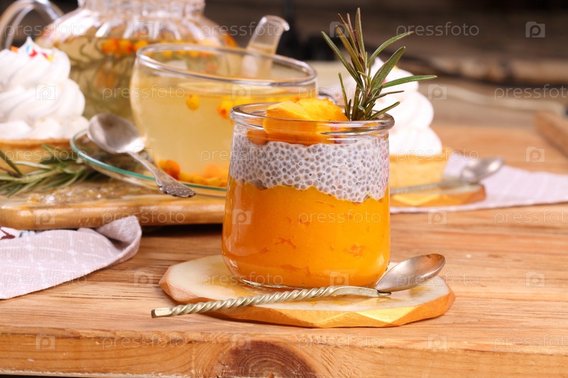 Облепиховый чай с десертом с чиа на деревянном фоне