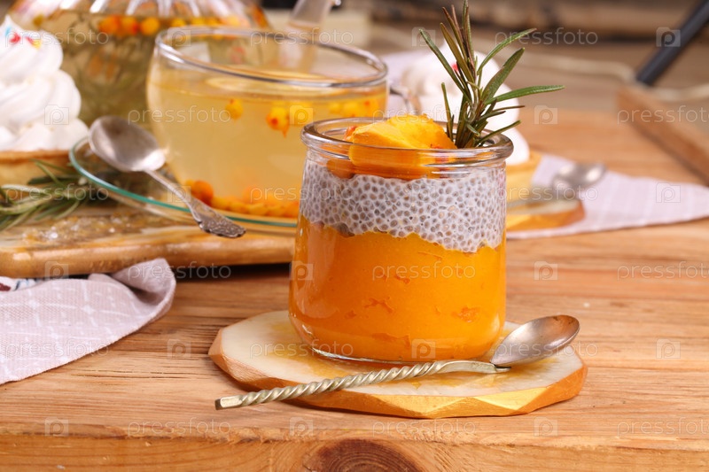 Облепиховый чай с десертом с чиа на деревянном фоне