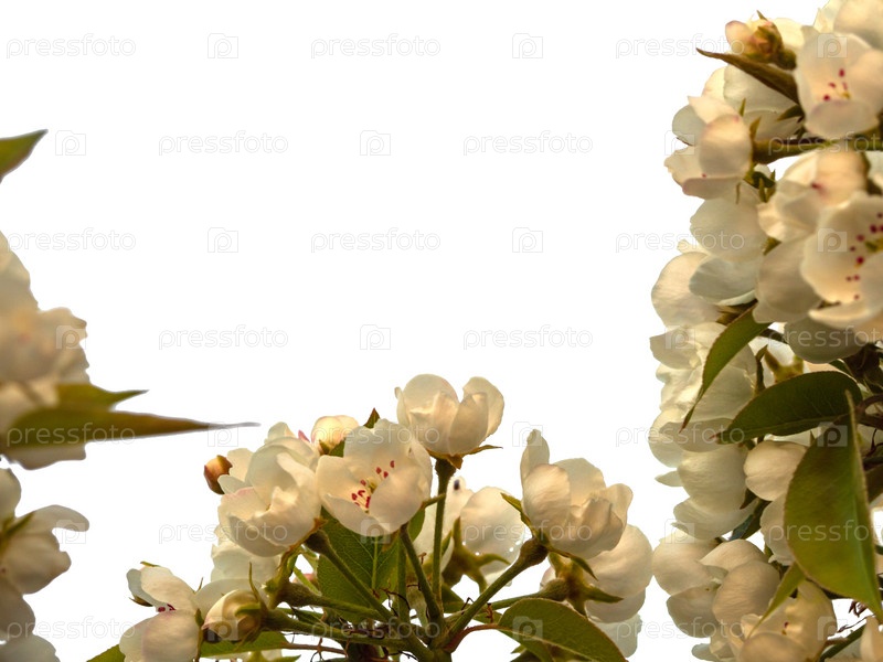 Цветы грушевого дерева, изолированные на белом фоне. Шаблон дизайна весенних фруктовых цветов, малая глубина резкости. Образец весенней открытки