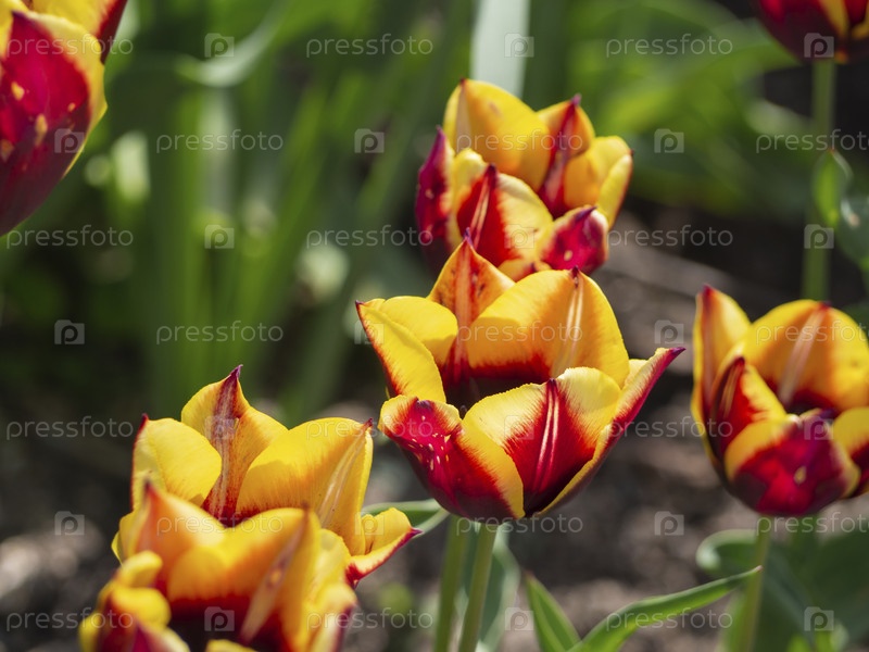 Крупный план весеннего цветения красно-желтого цветка тюльпана в саду. Несфокусированный фон