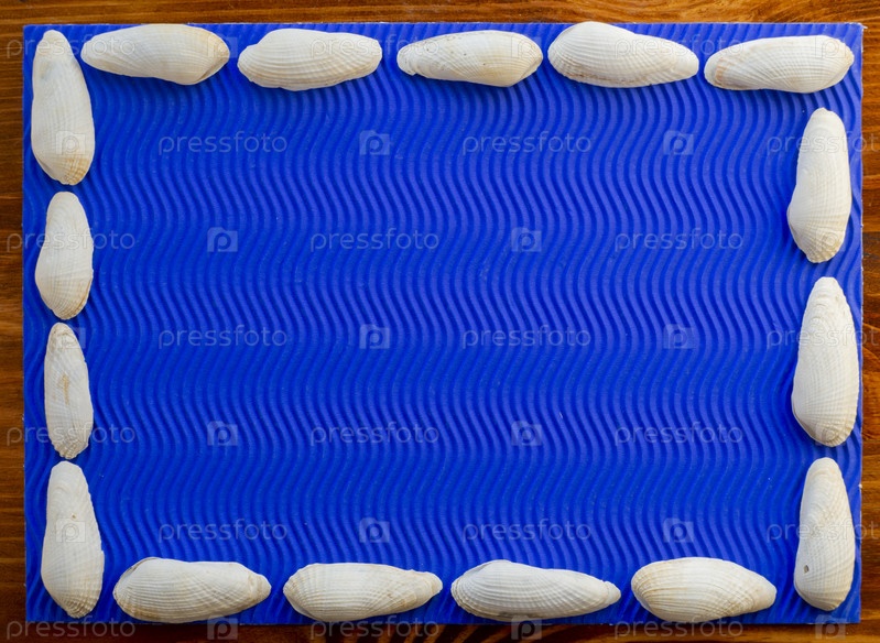 Плоский вид сверху. Текстурная композиция на деревянной поверхности представляет собой голубой волнистый лист с обрамлением из белых ракушек по краям