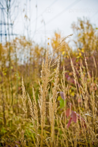 Осенний пейзаж с опавшими листьями и сухой травой крупным планом