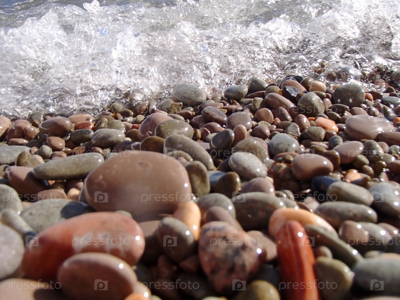 Морской прибой. Волна накатывается на галечный пляж. Солнечные блики на поверхности моря