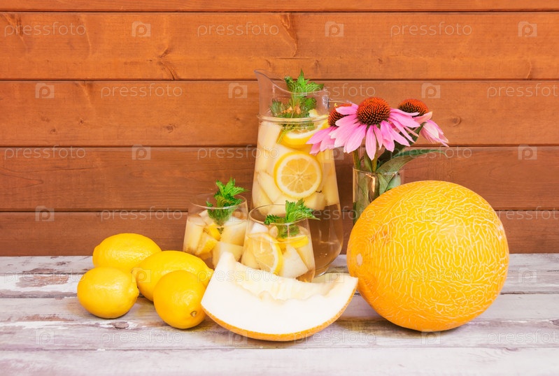 Освежающий летний лимонад из дыни, лимоны, дыня и цветы эхинацеи на старом деревянном столе