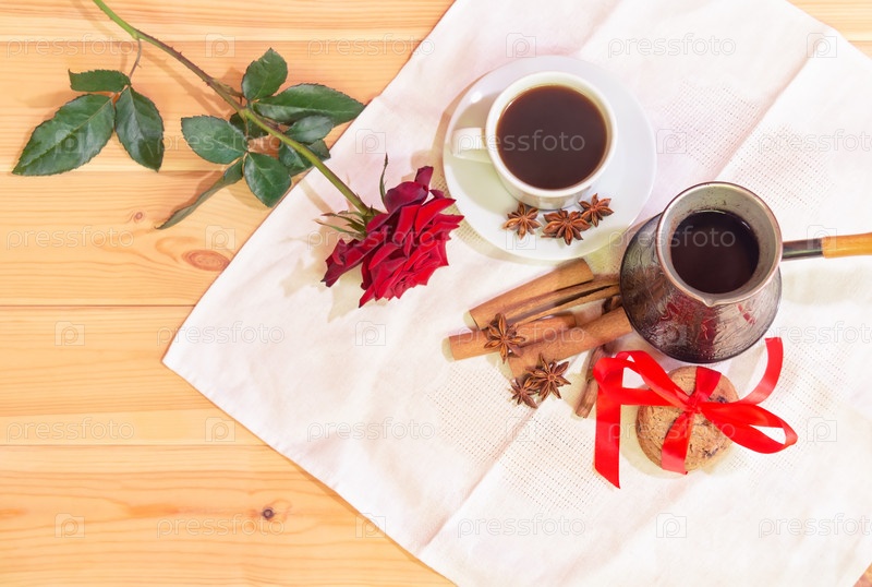 Чашка кофе, турка, печенье, специи и красная роза. Вид сверху