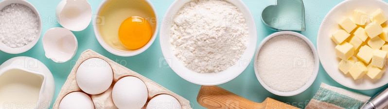 Выпечка или приготовление пищи фон. Ингредиенты, кухонные принадлежности для выпечки