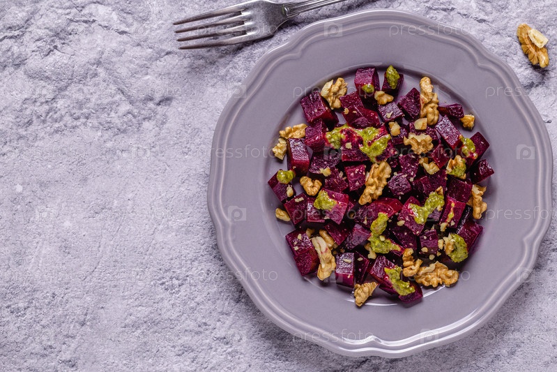 Свекла, соус песто и салат из грецких орехов