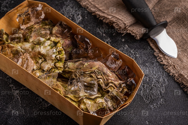Свежие устрицы крупным планом на льду, подаются с лимоном и вином