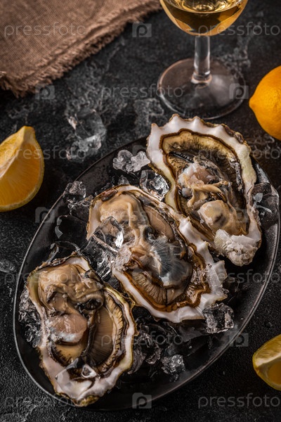 Свежие устрицы крупным планом на льду, подаются с лимоном и вином