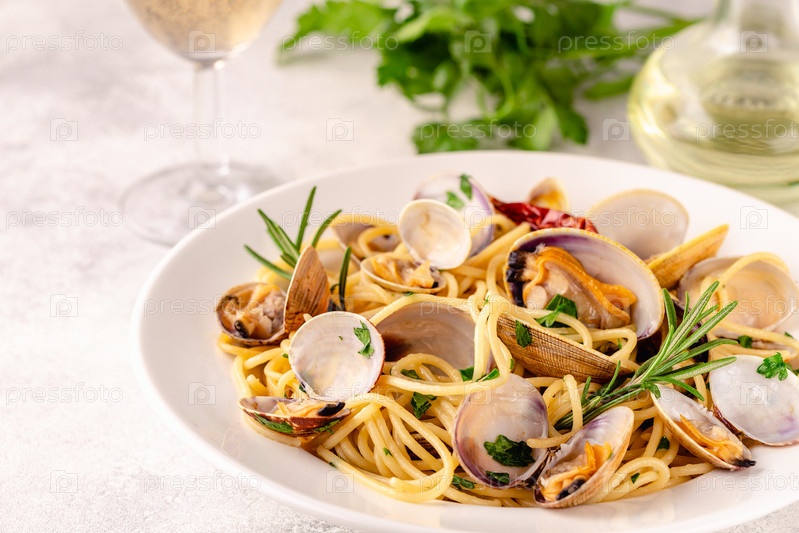 Паста из морепродуктов с моллюсками Спагетти алле Вонголе на светлом фоне