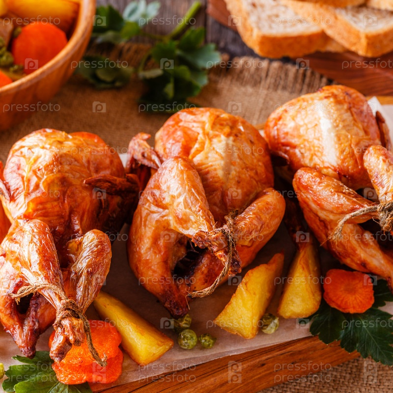 Жареный перепел с овощами на сервировочной доске