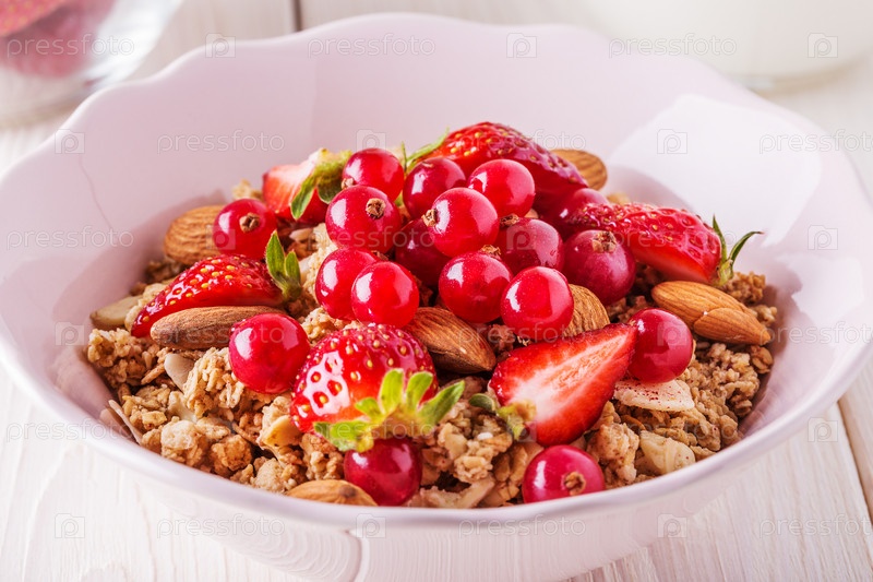 Здоровый завтрак - чаша мюсли овса со свежими фруктами, миндалем и белым шоколадом