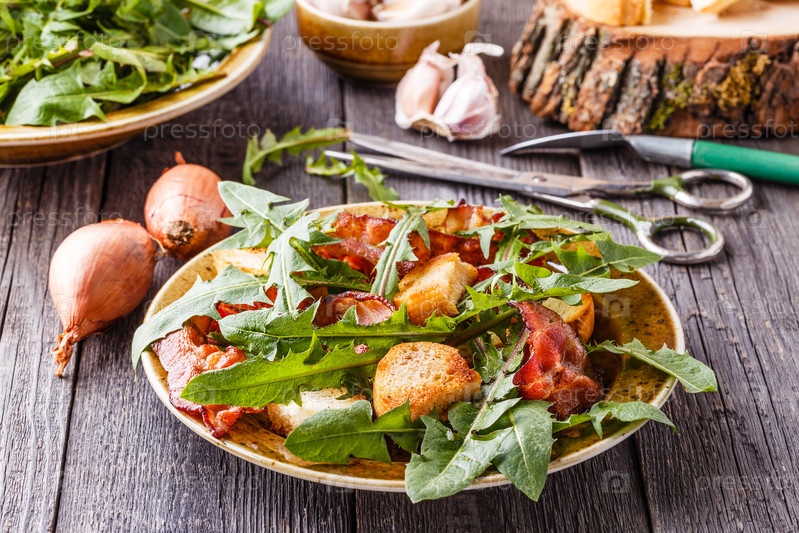 Салат из свежих одуванчиков с жареным беконом и чесночными гренками