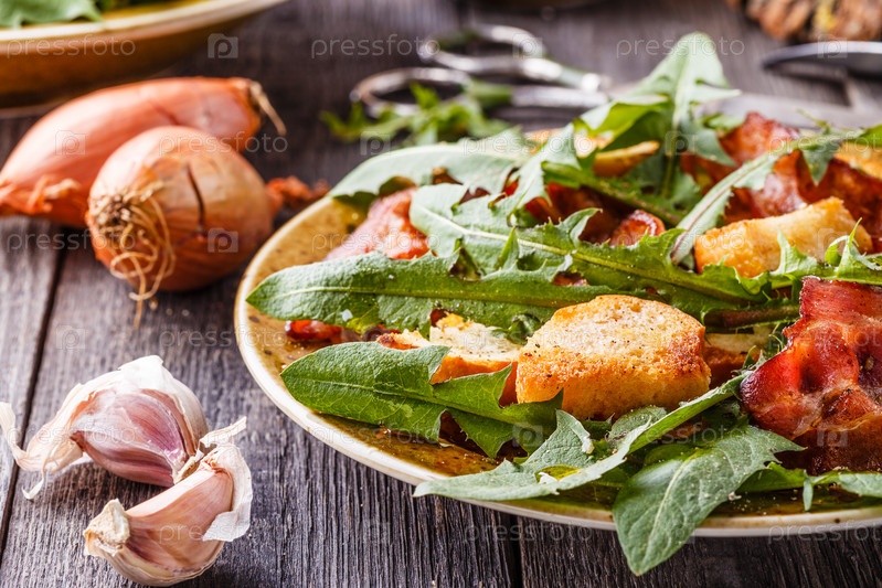 Салат из свежих одуванчиков с жареным беконом и чесночными гренками