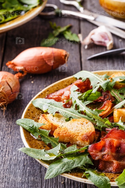 Салат из свежих одуванчиков с жареным беконом и чесночными гренками