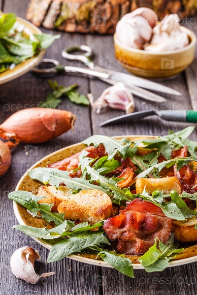 Салат из свежих одуванчиков с жареным беконом и чесночными гренками