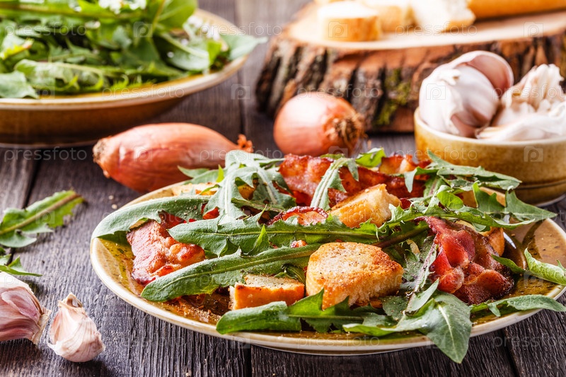 Салат из свежих одуванчиков с жареным беконом и чесночными гренками
