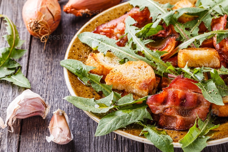 Салат из свежих одуванчиков с жареным беконом и чесночными гренками