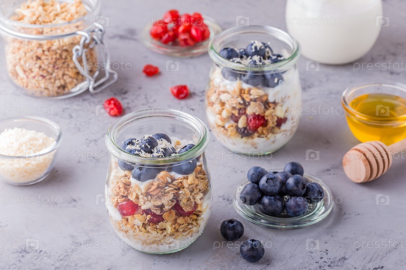 Здоровый завтрак - стеклянные банки овсяных хлопьев со свежими фруктами, йогуртом и медом