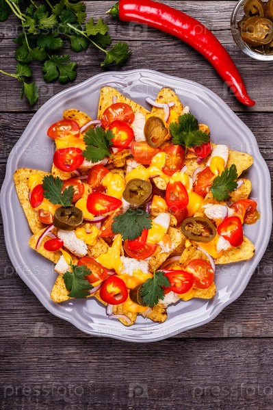 Начос с соусом из плавленого сыра, халапеньо, курицей и овощами