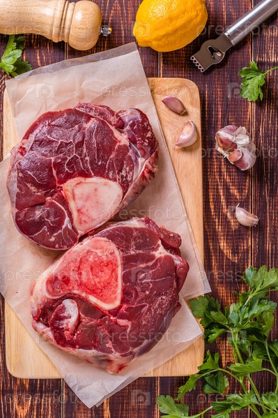 Сырая свежая говядина, нарезанная крестиком для оссобуко на разделочной доске с ингредиентами для приготовления гремолаты