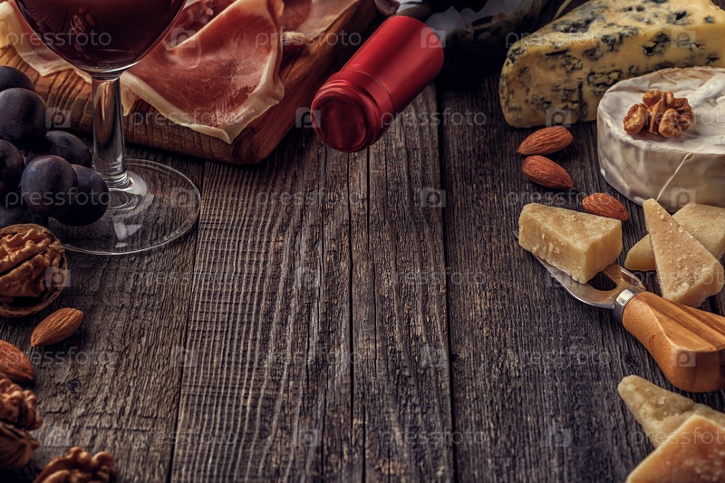 Сыр, орехи, виноград и красное вино на деревянном фоне