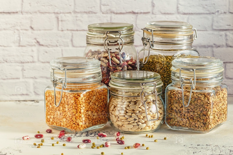 Стеклянные банки с различными бобовыми - фасолью, машом, горохом и леном