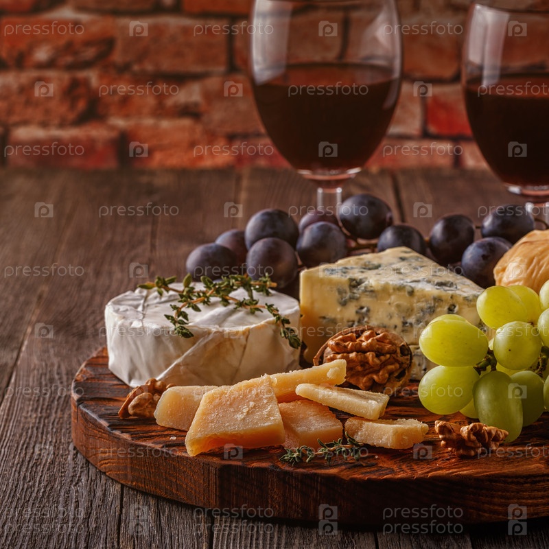 Сыр, орехи, виноград и красное вино на деревянном фоне