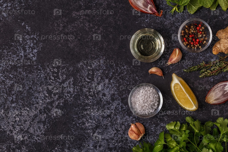 Фон со специями, травами и оливковым маслом