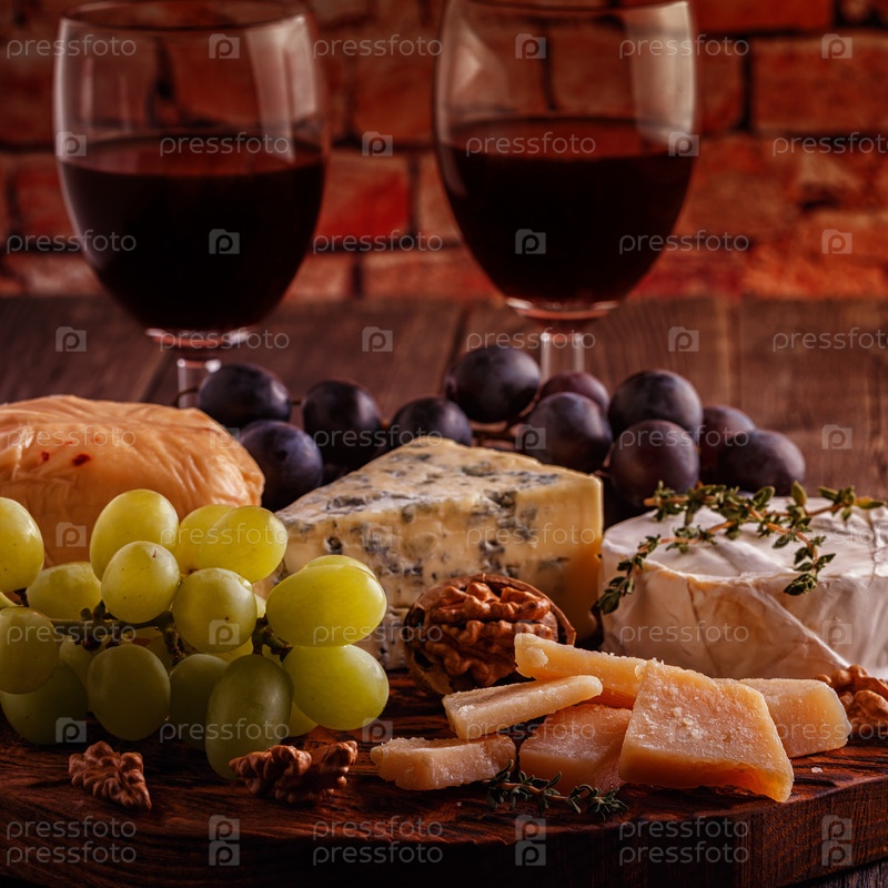 Сыр, орехи, виноград и красное вино на деревянном фоне