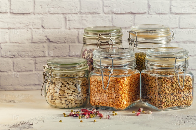 Стеклянные банки с различными бобовыми - фасолью, машом, горохом и леном