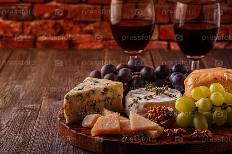Сыр, орехи, виноград и красное вино на деревянном фоне
