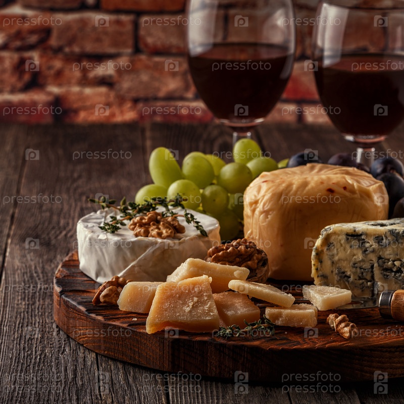 Сыр, орехи, виноград и красное вино на деревянном фоне
